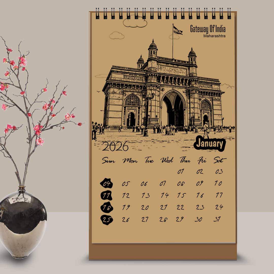 Travel across India without leaving your desk! Our 2026 Indian Famous Places Calendar showcases 12 iconic destinations from royal palaces and ancient temples to tranquil coasts and mountain views. Printed on premium kraft board, it carries a natural tone which adds elegance to any space. Let every month remind you of India’s diversity, beauty, and magic a true celebration of travel and tradition.